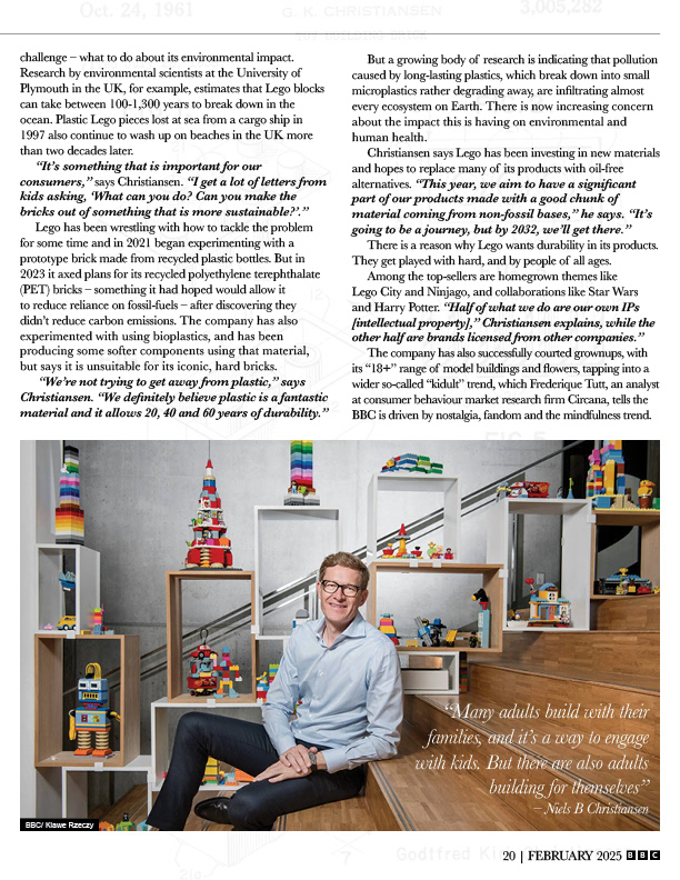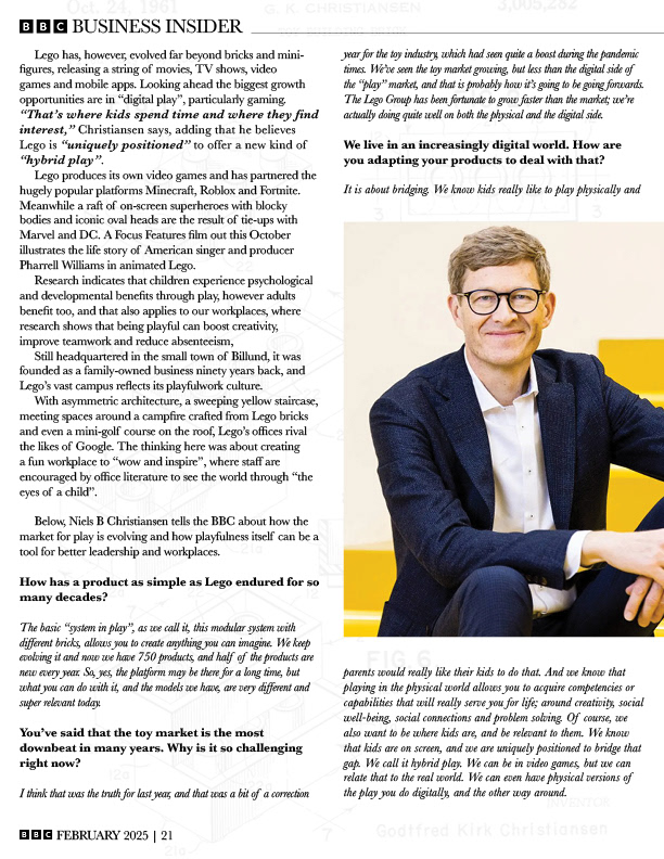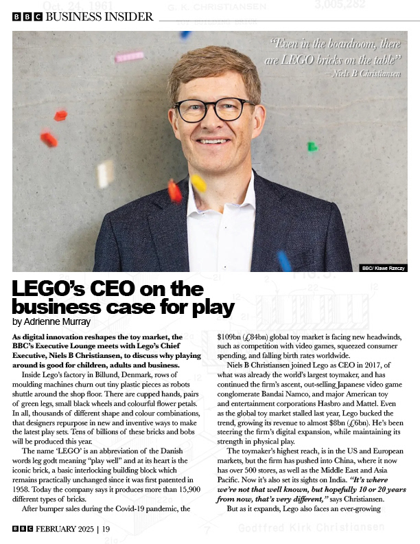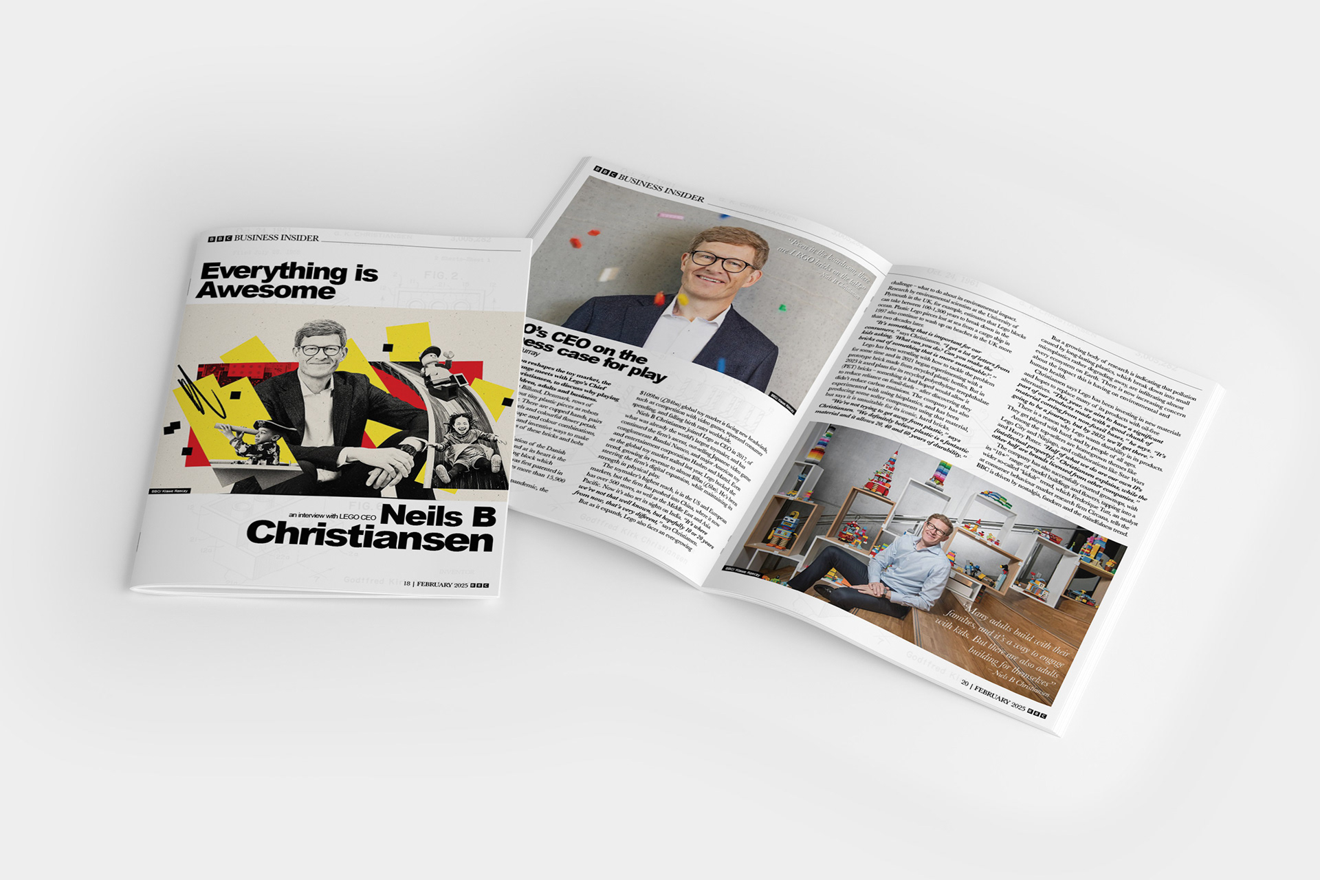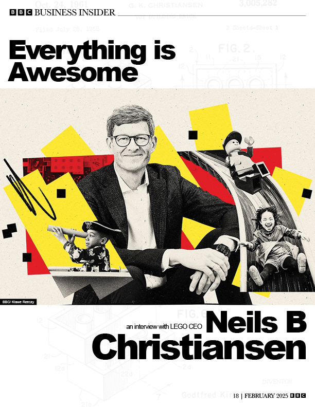 Designed a multi-page editorial feature for BBC Business Insider centered on an interview with LEGO CEO Niels B. Christiansen, combining structured typography with bold, layered visual storytelling. The layout integrates a consistent grid system with dynamic full-bleed imagery, pull quotes, and multi-column text to guide the reader through dense content while maintaining visual interest. Bright, geometric color elements inspired by LEGO bricks are used to create contrast and reinforce the subject matter without overwhelming the editorial structure. This project demonstrates a strong understanding of hierarchy, pacing, and the balance between expressive visuals and clear, readable long-form content.
