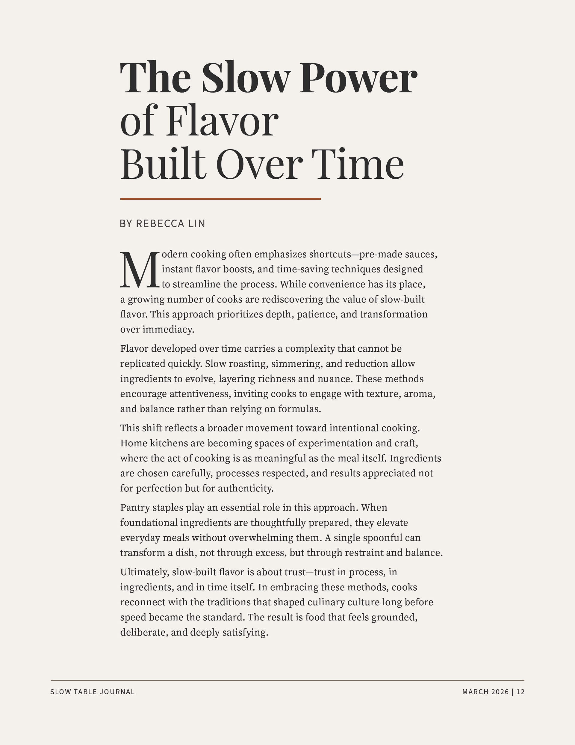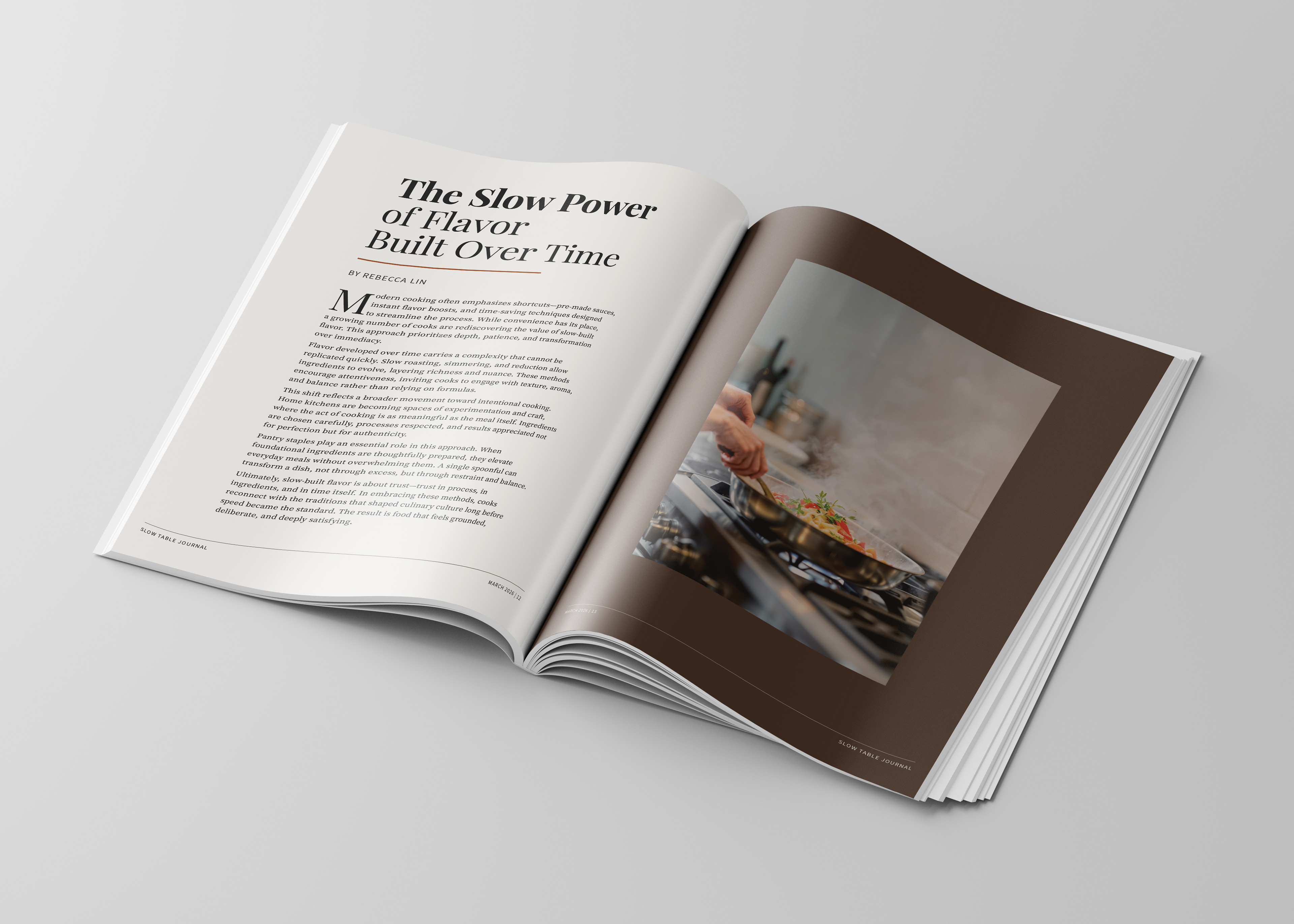 Designed a multi-page editorial feature for Slow Table Journal, exploring the theme of intentional, slow cooking through refined typography and restrained layout. The design emphasizes readability and pacing, using a structured grid, generous white space, and classic serif typography to support long-form content. A warm, minimal color palette and carefully integrated imagery create a calm visual rhythm that reinforces the subject matter. This project demonstrates an understanding of editorial hierarchy, typographic control, and the creation of a cohesive, immersive reading experience.