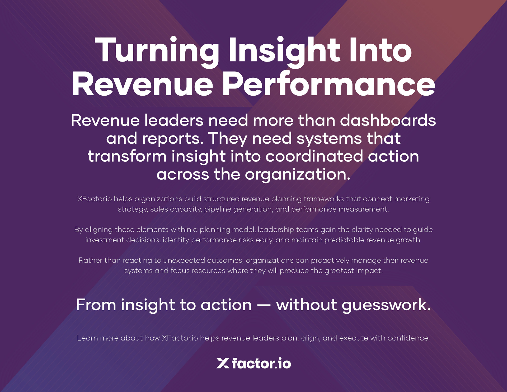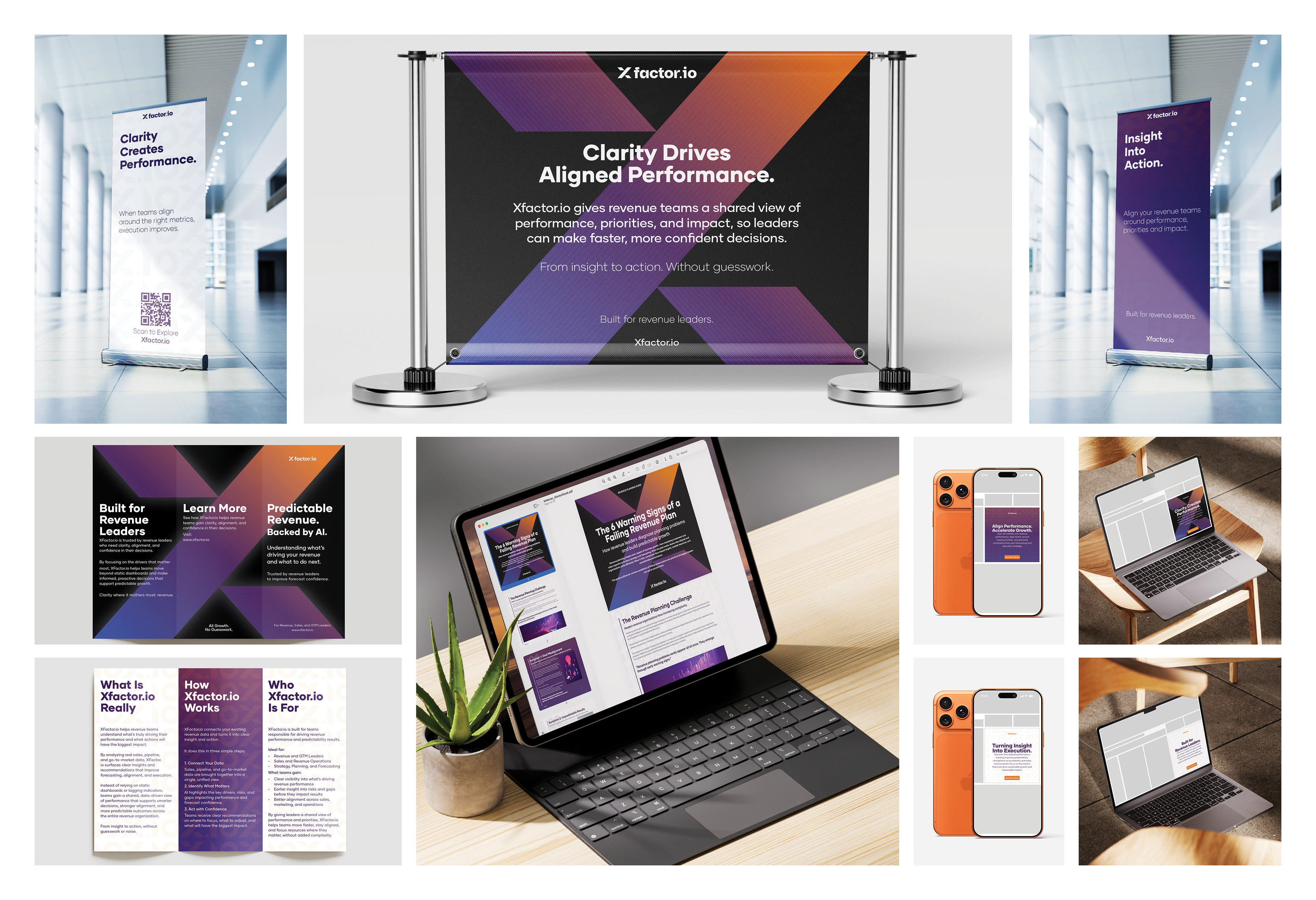 Designed a cohesive marketing campaign for Xfactor.io, focused on communicating clarity, alignment, and data-driven decision-making for revenue teams. The visual system uses bold geometric forms and a high-contrast gradient palette to create a strong, recognizable identity across multiple touchpoints. Assets were developed for both print and digital applications, including event signage, social media, web layouts, and mobile experiences, ensuring consistency across platforms. This project demonstrates the ability to translate brand messaging into a unified campaign system that is both visually engaging and strategically aligned.