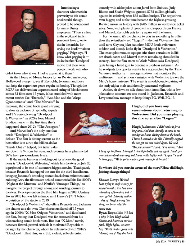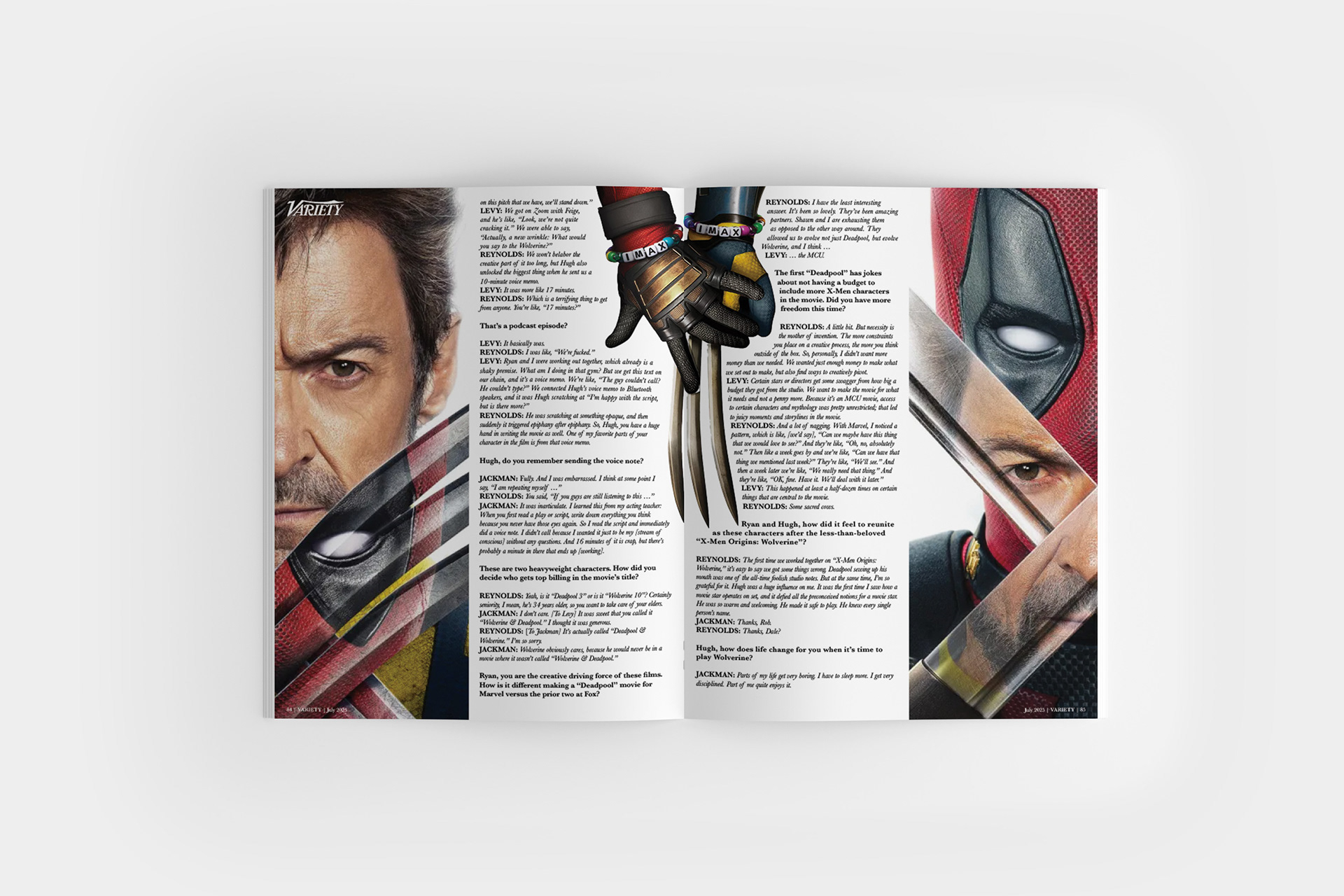 Designed a multi-page magazine feature inspired by Variety, focusing on editorial hierarchy, typography, and image integration. The layout balances bold, cinematic imagery with dense interview content through a structured grid system, allowing for clear readability while maintaining visual impact. The opening spread functions as a feature opener, establishing tone and drawing the reader into the article, while subsequent spreads maintain consistency across multi-column text and image placement. This project demonstrates the ability to organize long-form content while creating rhythm, clarity, and engagement throughout the layout.