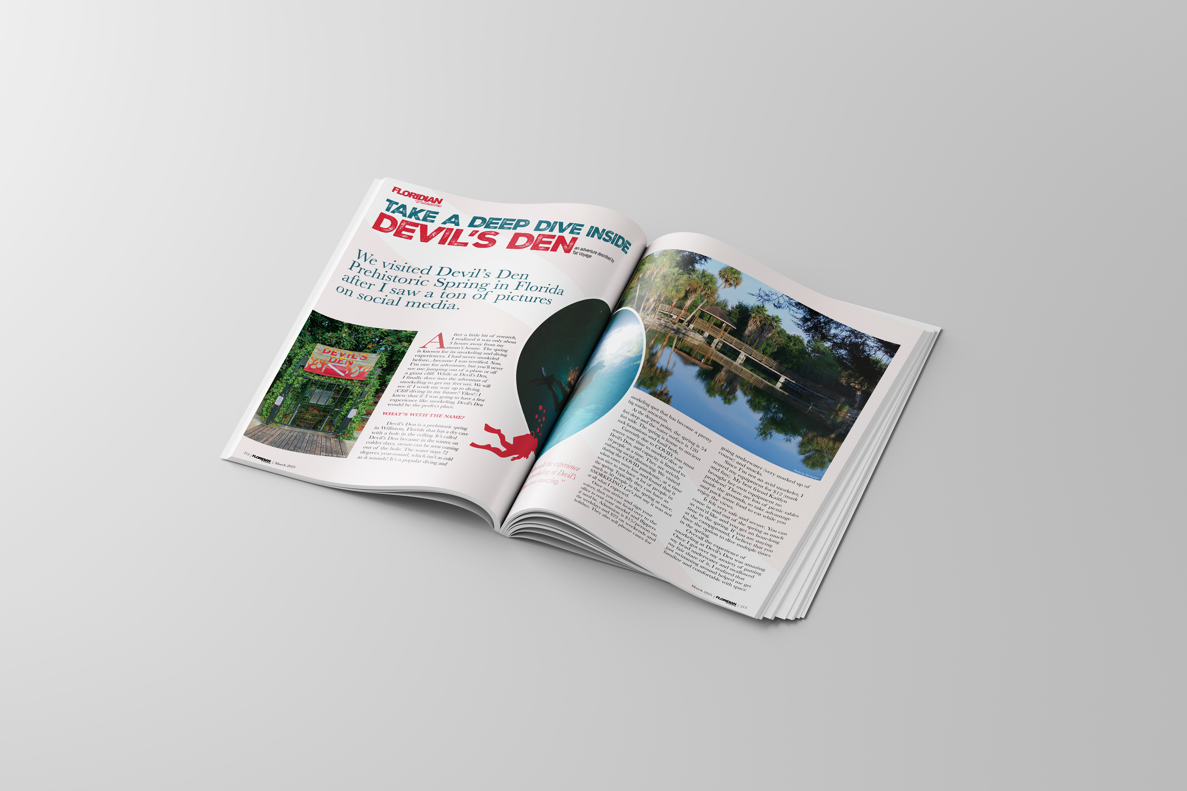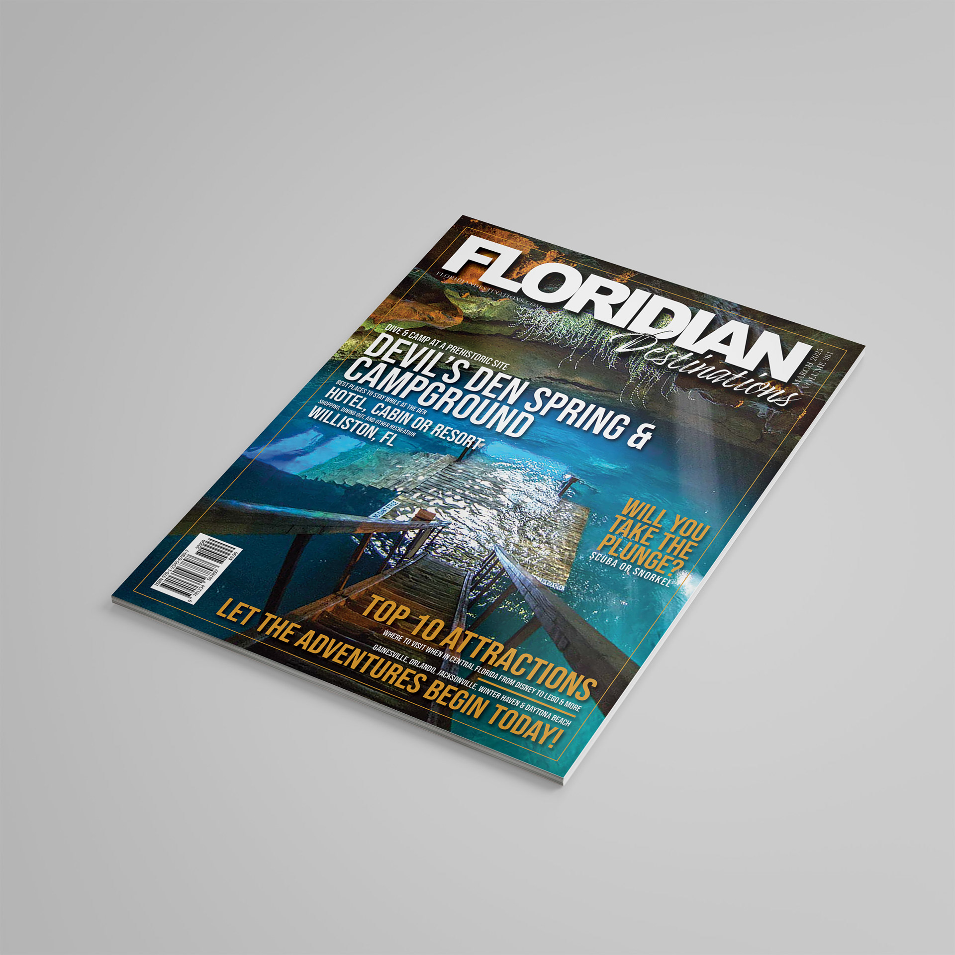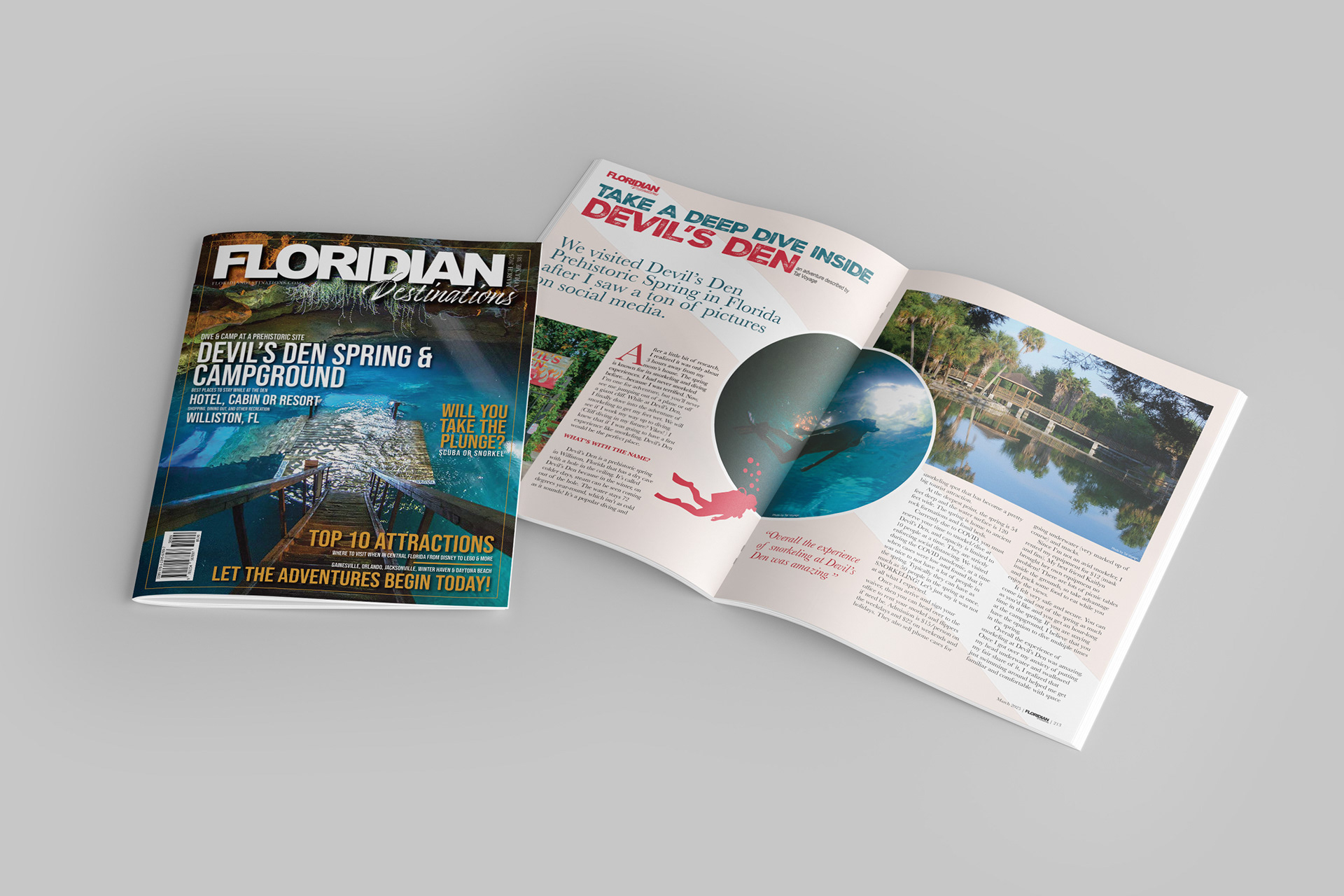 For the feature article, I chose Devil’s Den Spring & Campground, highlighting its underwater beauty and adventure. The cover photo showcases the cave’s stunning blues, balanced by warm orange typography to complement the natural lighting in the image. I emphasized font hierarchy to guide the reader’s eye from the title to supporting text, and added realistic details like a barcode for authenticity.