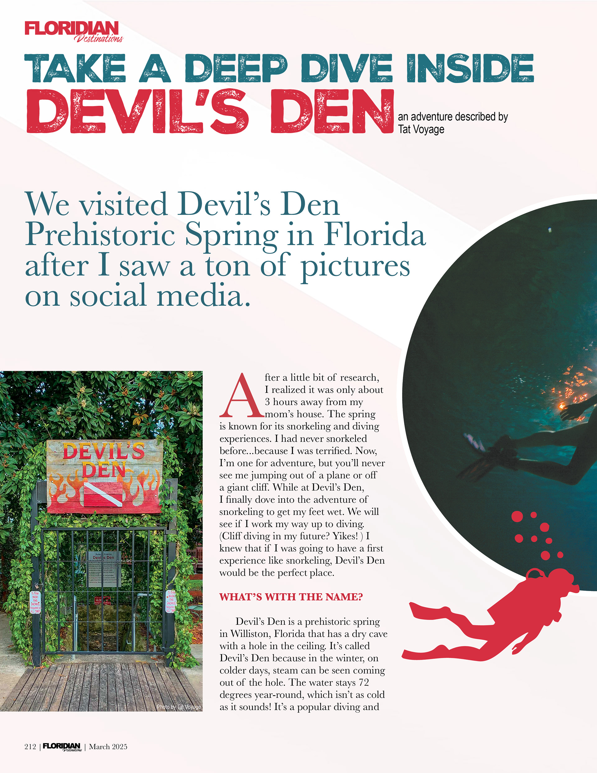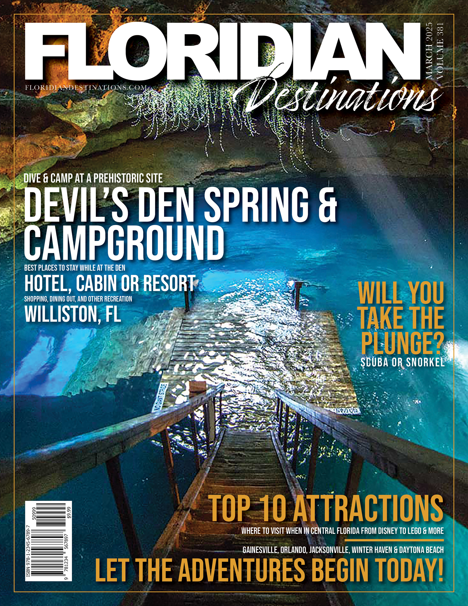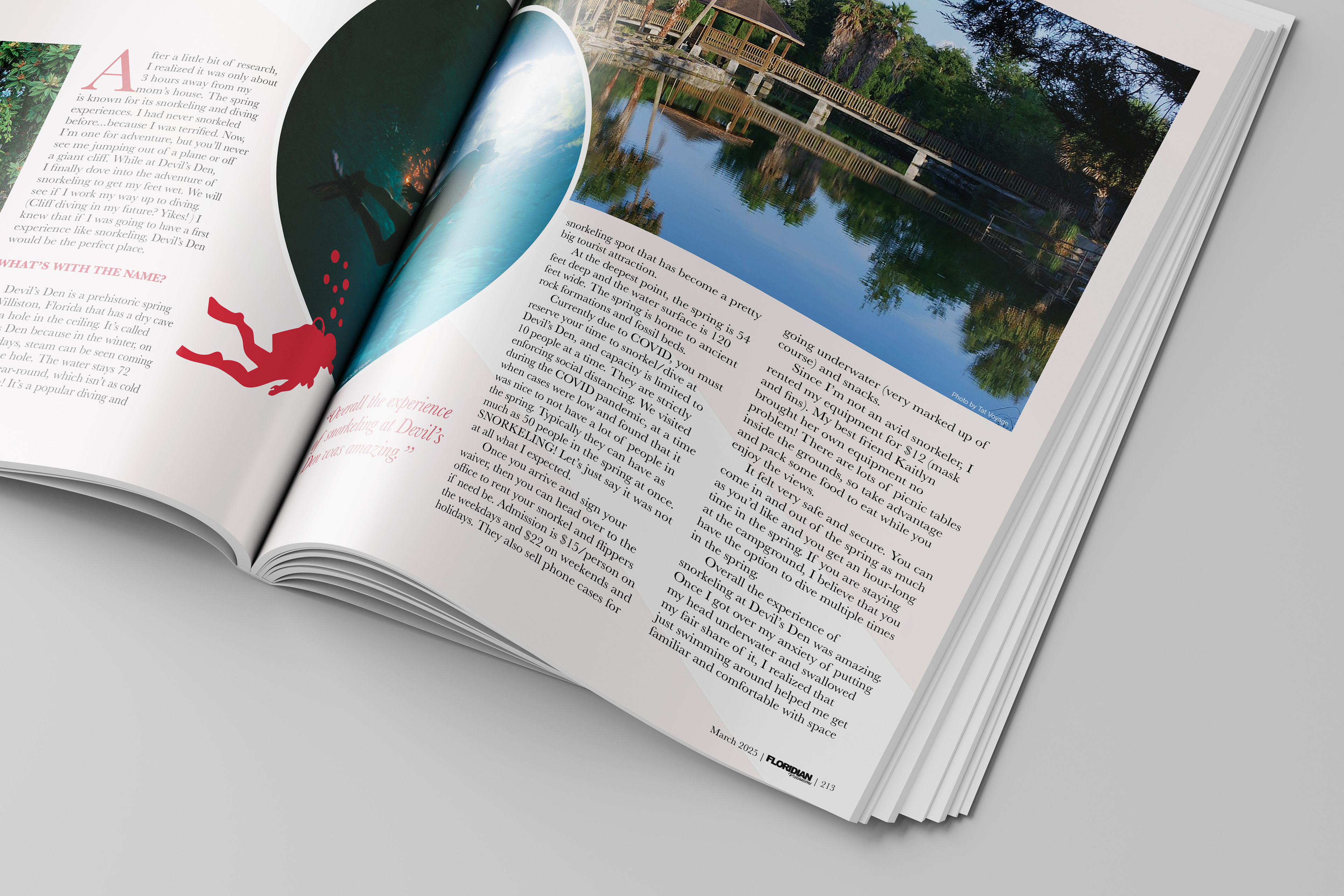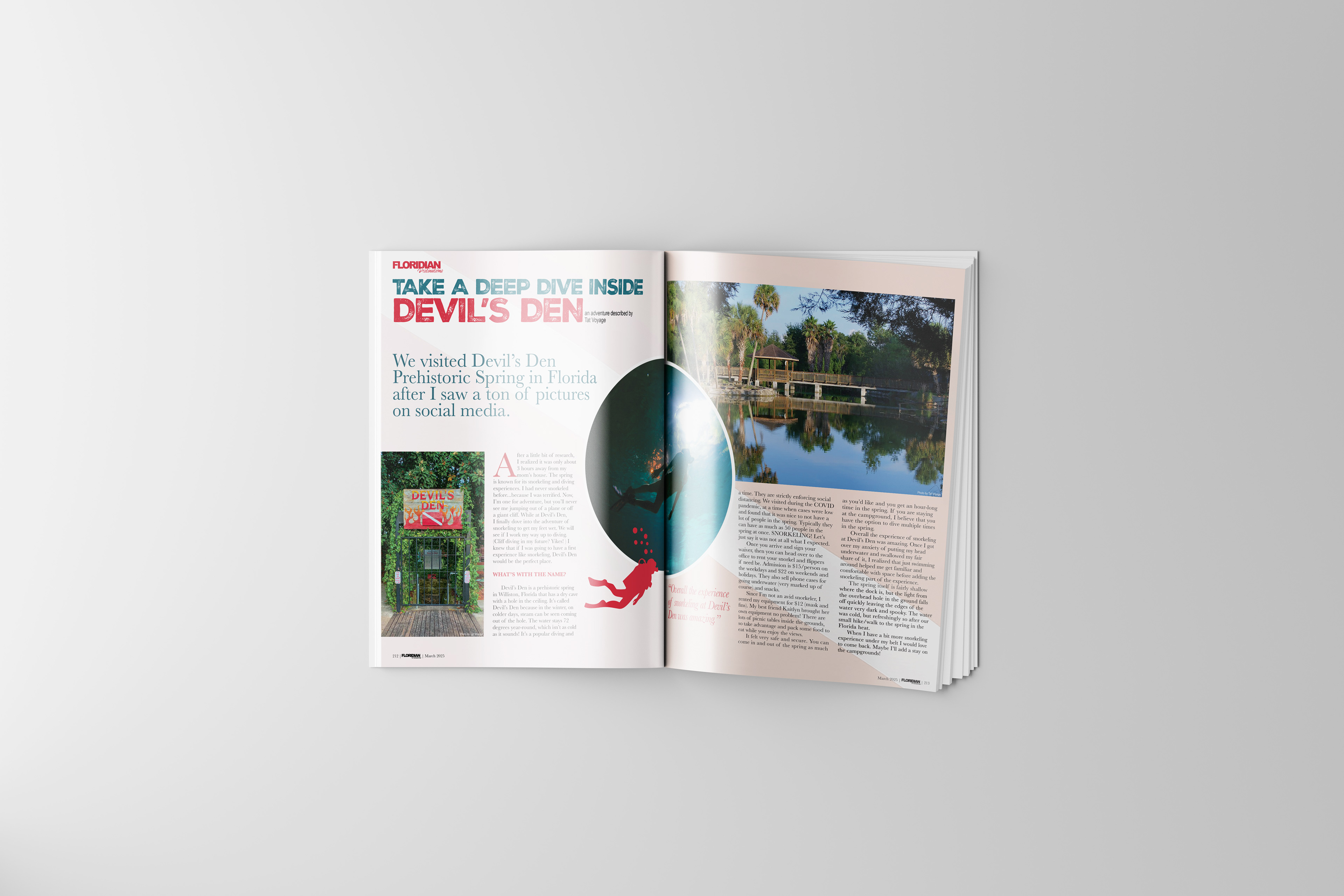 For the feature article, I chose Devil’s Den Spring & Campground, highlighting its underwater beauty and adventure. The cover photo showcases the cave’s stunning blues, balanced by warm orange typography to complement the natural lighting in the image. I emphasized font hierarchy to guide the reader’s eye from the title to supporting text, and added realistic details like a barcode for authenticity.