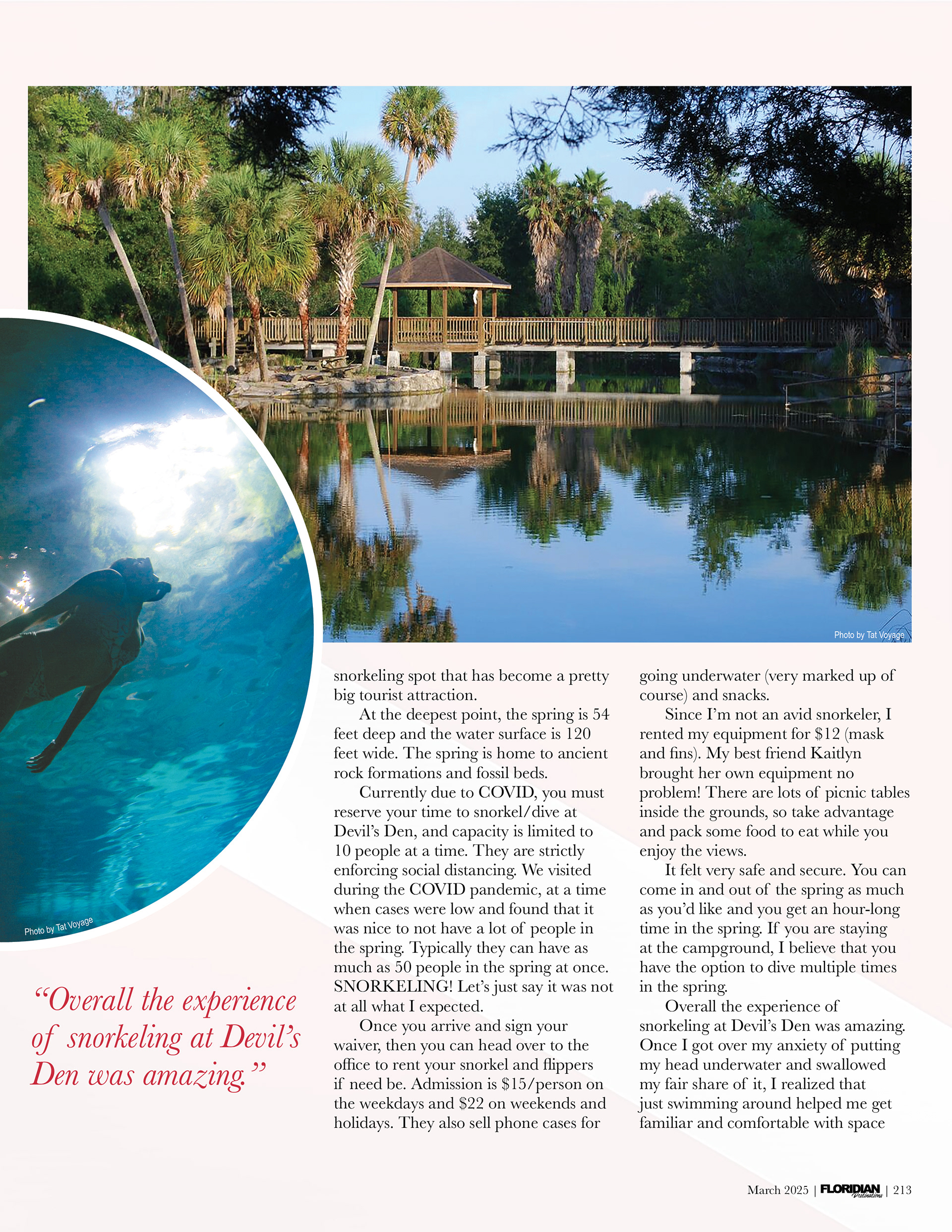 Inside, the two-page spread combines three photographs—the entrance gate, a snorkeling diver, and the surrounding park—arranged within a clean, two-column grid for readability. I layered a subtle diving flag graphic at low opacity for texture and unity. The color palette ties everything together, using reds and aquas from the photos for headers, drop caps, and quotes. The overall design integrates balance, flow, and contrast, creating a professional, cohesive layout that captures the spirit of Florida adventure travel.