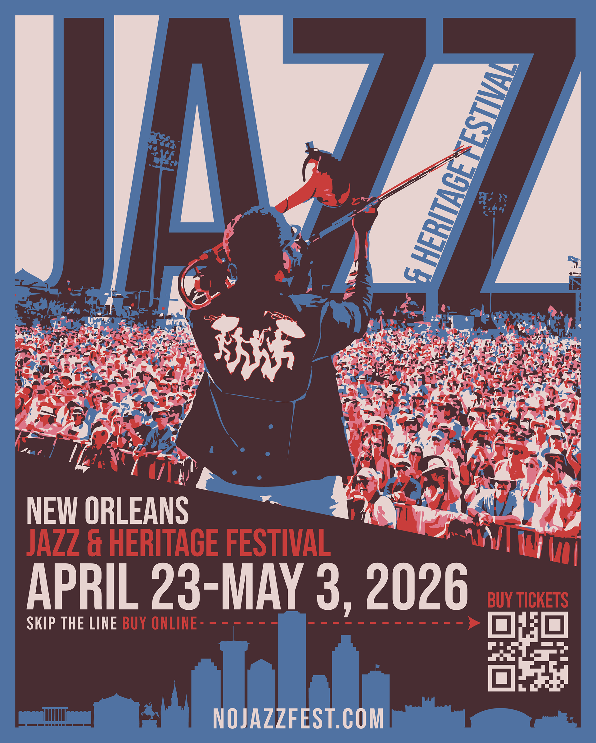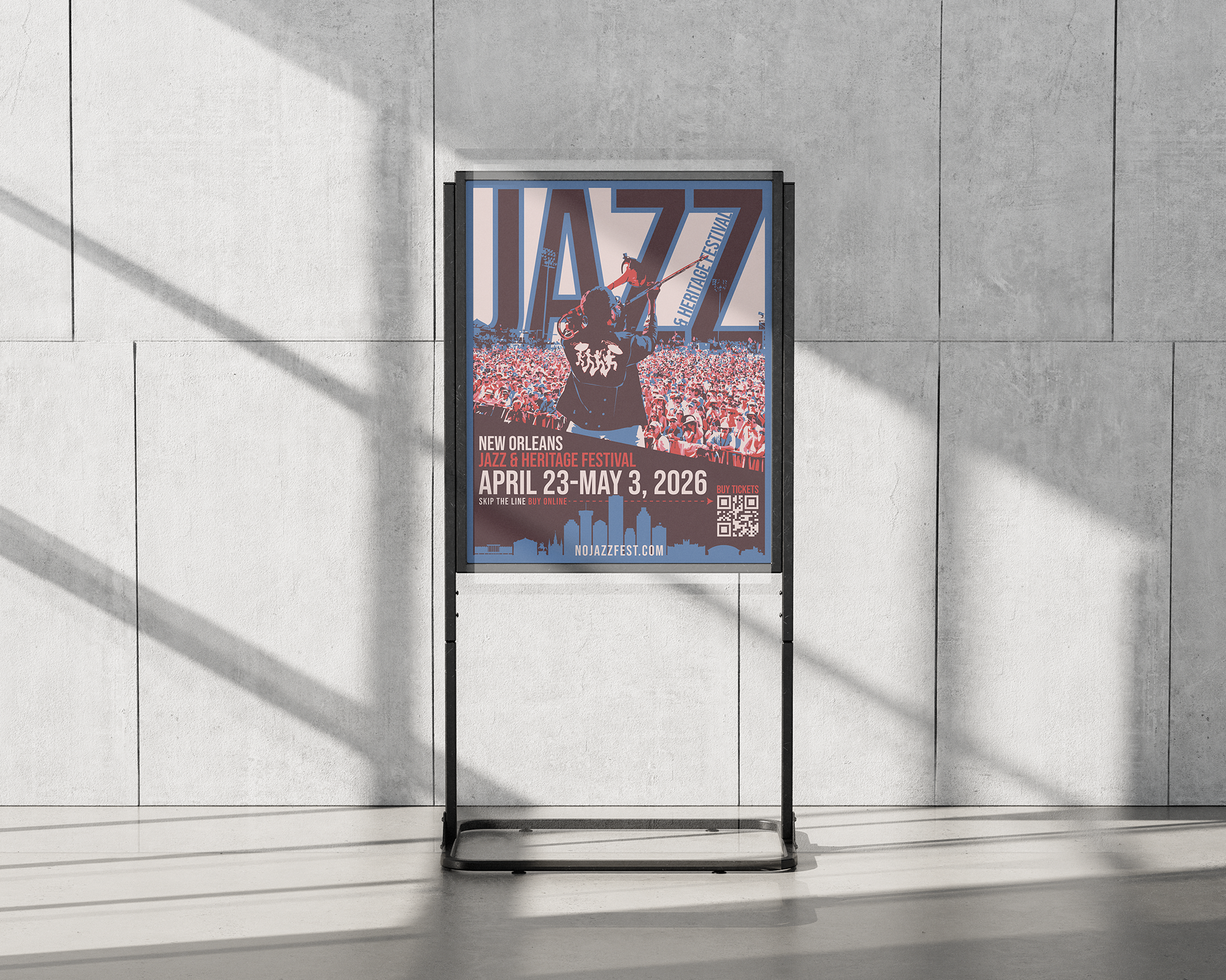 This poster for the New Orleans Jazz & Heritage Festival employs a strategic vector-based image trace workflow to transform a high-contrast photograph of a trumpeter performing before a massive crowd into a bold, five-color silkscreen-inspired illustration. Initial color grading in Photoshop established a harmonious palette of deep indigos, warm maroons, and vibrant corals, ensuring visual cohesion and brand alignment with the festival’s energetic identity. In Illustrator, a high-fidelity Image Trace preset reduced the composition to five flat vector shapes, preserving recognizable silhouettes while introducing stylized negative space—most notably the expansive sky, which serves as a typographic canvas for the oversized “JAZZ” lockup in reversed-out white. Secondary text (“& Heritage Festival”) is contour-fitted along the inner stroke of the terminal “Z,” activating otherwise dormant negative space and reinforcing hierarchy. A diagonal baseline at the lower third echoes the crowd barricade’s angle, anchoring a modular information block containing event details, a scannable QR code, and the festival URL. The New Orleans skyline silhouette wraps the poster’s perimeter as a continuous bleed element, contrasting the primary color fields and grounding the composition in geographic context. Centrally, the official Jazz & Heritage Festival logo is die-cut into the musician’s shirt, achieving brand integration without competing with the primary focal point. The result is a scalable, print-ready vector poster that balances photographic energy with graphic clarity, ideal for both digital portfolios and large-format festival signage.
