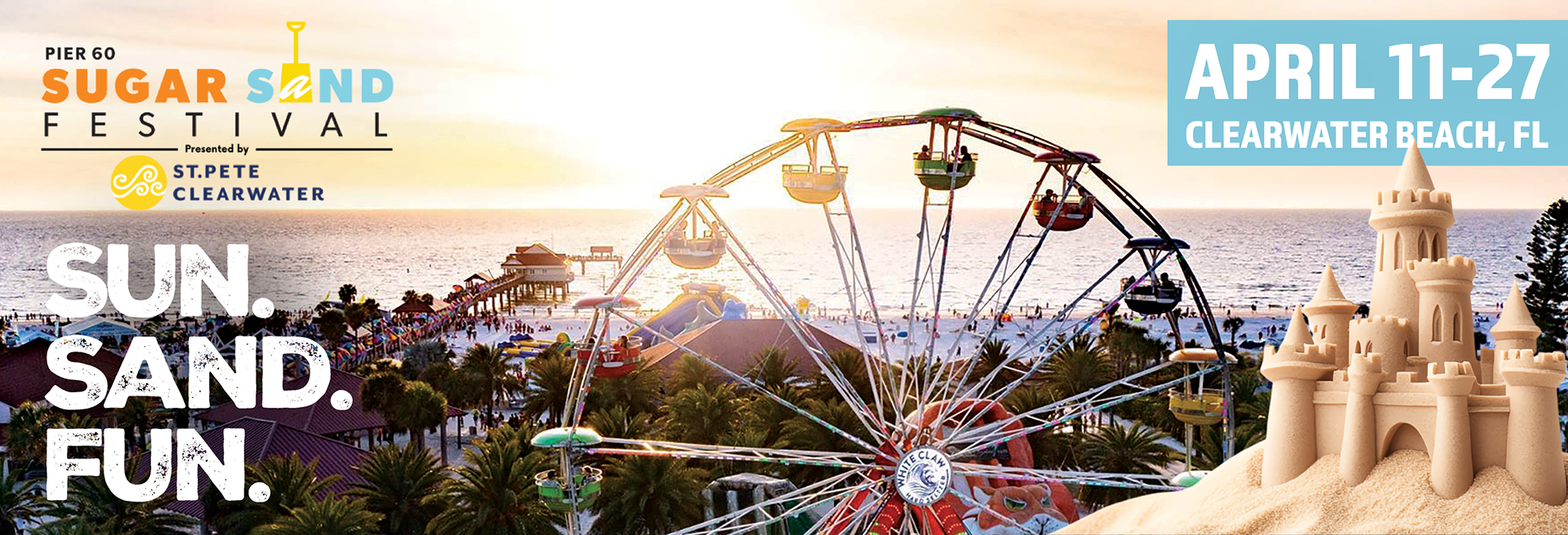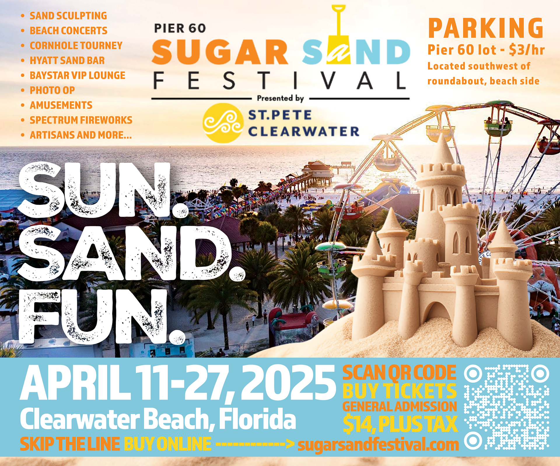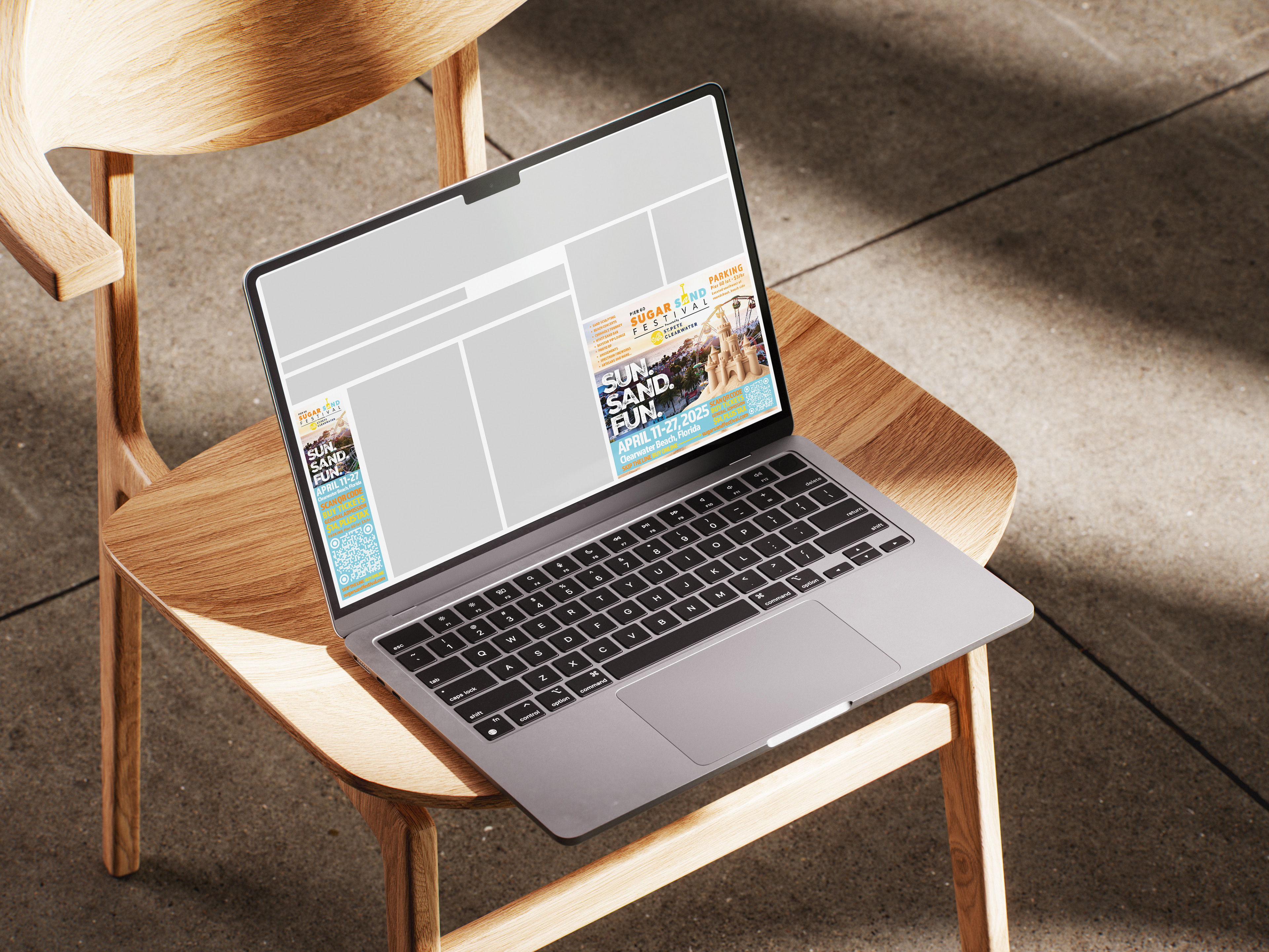 For this project, I designed a cohesive, multi-platform marketing campaign for the Pier 60 Sugar Sand Festival in St. Pete–Clearwater, developing a poster, web banners, and a billboard that shared a unified visual identity. I began in Adobe Photoshop, incorporating the festival’s existing logo and extracting its core color palette—blue, orange, and yellow—to establish brand consistency. The poster composition applied strong visual hierarchy and the rule of thirds, featuring a sunset photograph of Pier 60 with festival tents and a Ferris wheel to anchor the design in context. Layered graphic elements, including a custom sandcastle illustration, created depth and balance, while the tagline “SUN. SAND. FUN.”—set in an all-caps textured typeface—served as the dominant focal point across all materials. A contrasting blue footer bar provided structure for key information, including the event date, location, and a QR code call-to-action for online ticket sales. I then transitioned into Adobe Illustrator to build the responsive web banners and billboard, adapting the layout and content hierarchy for each format while maintaining consistent typography, iconography, and brand color application. The result is a unified visual campaign that conveys energy, warmth, and excitement, strengthening the festival’s identity across both print and digital media.